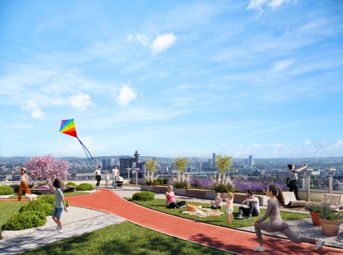 Zato je coworking prostor apsolutno idealan. Naravno, ukoliko su vam i drugi sadržaji na dohvat ruke. Kao što je, recimo, krov na parku. Ili atletska staza... a tu su i pošta i banka i prodavnice, kao i obdanište, jer najbitnije je da najmlađi budu zbrinuti. I sve to na samo jednu vožnju liftom i na 2-3 minuta od stana.