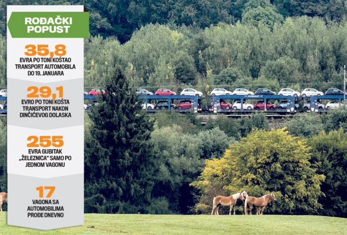 - Odmah po preuzimanju direktorskih ovlašćenja, Dinčić je 3. februara suspendovao ovu odluku, te dodatak na cenu za specijalne pošiljke smanjio za 30 odsto. Tako će njegov bliski rođak transport automobila plaćati 29,1 evro po toni tereta. Računajući da je jedan vagon težak 38 tona, jasno je da će „Železnice“ gubiti 255 evra samo po jednom vagonu, a dnevno našim prugama prolazi Petkovićeva kompozicija od 17 vagona - objašnjava naš izvor sa železnice, napominjući da je to klasični sukob interesa.