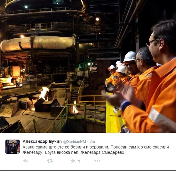 "Od danas će Železara praviti novih 400 miliona dolara, i to je novih jedan odsto rasta za celu Srbiju u narednoj godini, podvukao je premijer. Vučić je rekao da su u toku pregovori sa strateškim kineskim partnerom Hebej ajron end stil grupa" (HBIS grupa) i da je reč o drugoj ili čak najmoćnijoj čeličana u svetu.