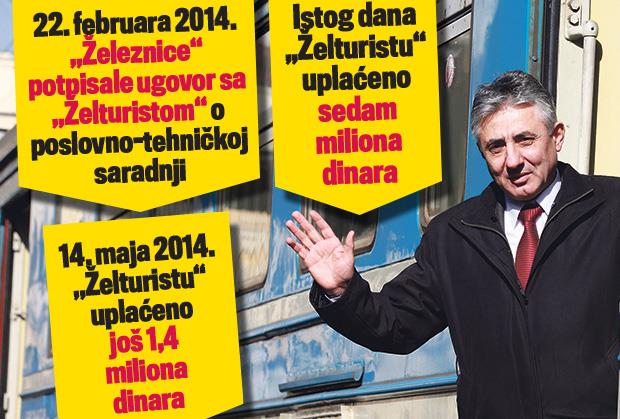 - „Želturist“ je 12. maja 2014. godine ispostavio još jedan predračun na iznos 1,4 miliona dinara. Predračun je plaćen posle tri dana, a potpisao ga je tadašnji pomoćnik generalnog direktora za pravne poslove, opšte poslove i ljudske resurse. Tek 22. oktobra prošle godine „Želturist“ je „Železnicama“ dostavio dopis da je primio avans od 8,4 miliona dinara, a 4. novembra i ponudu u kojoj se zaposlenima u „Železnicama Srbije“ od 15. novembra nudi 40 mesta u jednoj smeni u hotelu „Železničar“ u Vrnjačkoj Banji po ceni 1.925 dinara za pun pansion po osobi - kaže sagovornik Kurira.