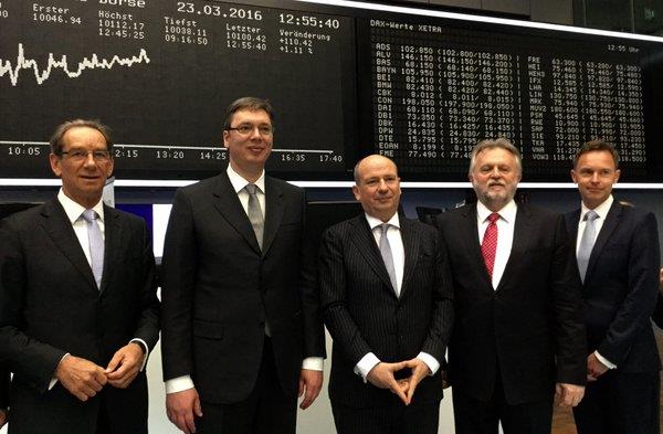 BEOGRAD - Premijer Srbije Aleksandar Vučić posetio je danas Frankfurtsku berzu i tom prilikom istakao važnost saradnje srpskih i nemačkih privrednika.