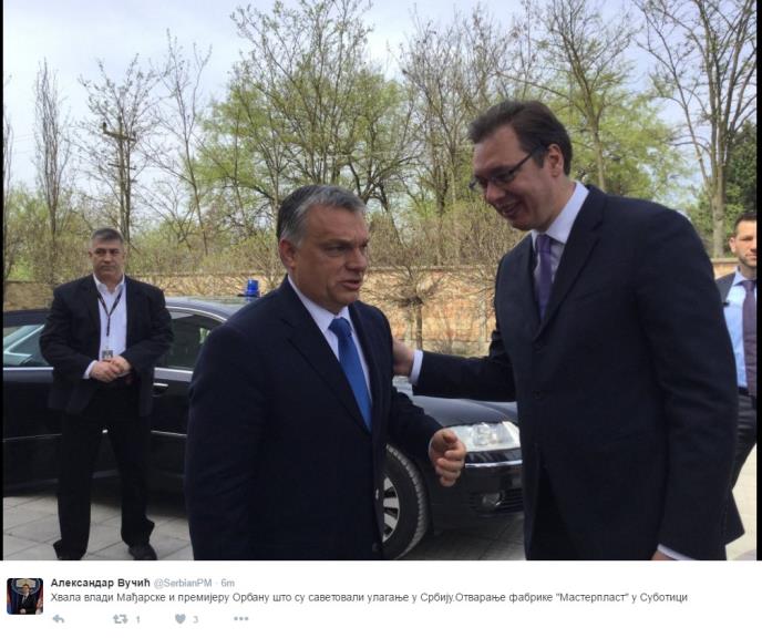 "Sa Mađarskom ćemo da gradimo najbolje u budućnosti. Hvala Viktore (Orban, premijer Mađarske) na podršci Srbiji u teškim trenucima, ne samo u podršci u poplavama, preduzećima, na putu ka EU, jer Mađarska nas ničim ne ucenjuje i ne ograničava i to Srbija poštuje i ceni. Prave prijatelje umemo da zapamtimo", rekao je Vučić, koji je sa Orbanom obišao novi pogon mađarske kompanije "Masterplast" za proizvodnju staklene vune.
