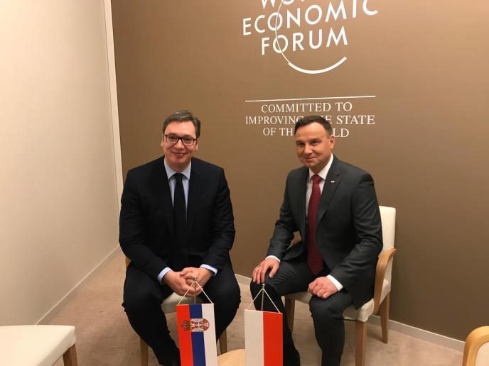 BEOGRAD - Predsednik Srbije Aleksandar Vučić sastao se danas u Davosu gde prisustvuje Svetskom ekonomskom forumu sa predsednikom Poljske Andžejem Dudom sa kojim je razgovarao o bilateralnim odnosima, evropskom putu Srbije i situaciji u regionu.