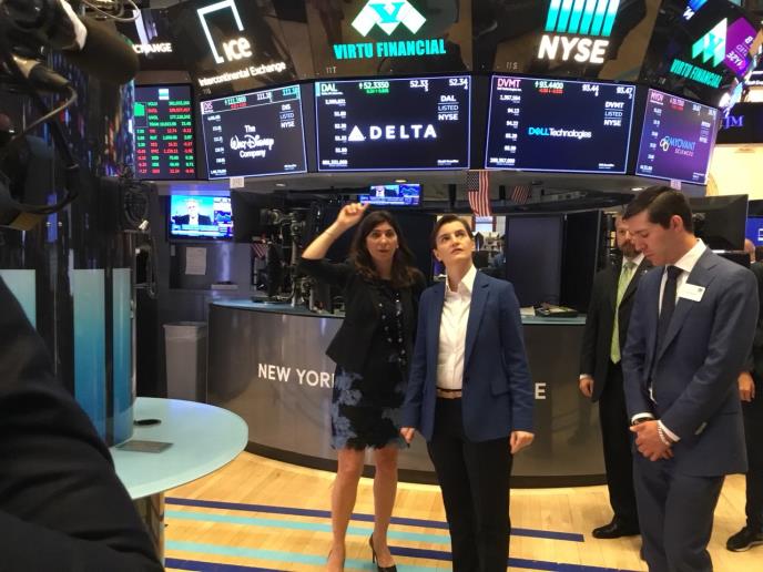 Premijerka Srbije Ana Brnabić obišla je Njujoršku berzu i razgovarala s predsednicom te berze Stejsi Kaningem o najvažnijim rezultatima strukturne reforme koje je Srbija sprovela, saopštila je danas Vlada Srbije.