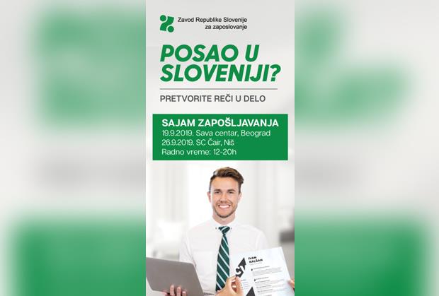 U cilju što bolje informisanosti zainteresovane javnosti, 19. i 26. septembra Zavod Republike Slovenije za zapošljavanje će organizovati sajmove zapošljavanja u Srbiji: u Beogradu i Nišu. Na sajmovima će učestvovati približno 30 slovenačkih poslodavaca, uključujući kompanije Krka d.d., Lek d.d., UKC Ljubljana, Revoz d.d., koncern Kolektor, Spar Slovenija d.o.o., Poslovni sistem Mercator d.d. i drugi. Detaljnije informacije o izlagačima koji učestvuju na raspolaganju su na posebnoj internet stranici:
