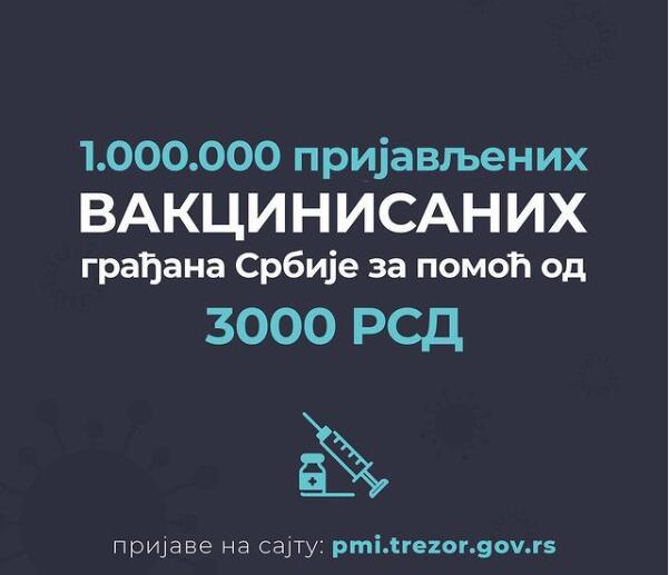 Ovog jutra smo prešli broj od milion prijavljenih vakcinisanih građana za novčanu pomoć u iznosu od 3.000 dinara. Želimo da što pre dostignemo kolektivni imunitet kako bismo mogli da se u potpunosti vratimo normalnom životu, objavio je ministar finansija Siniša Mali.