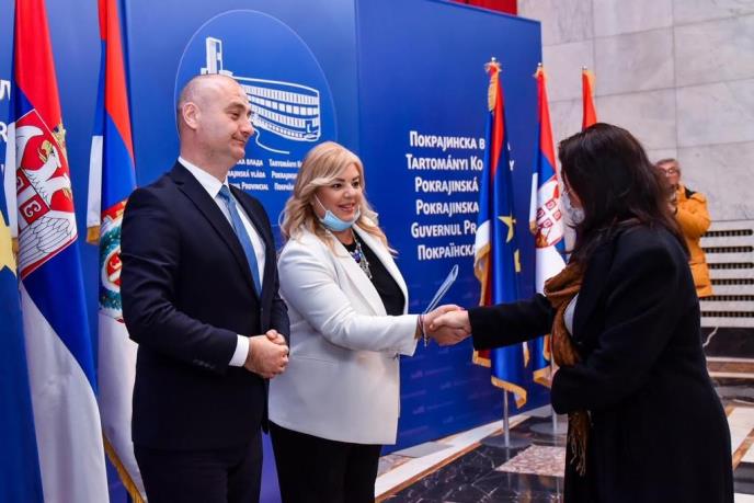 U holu Pokrajinske vlade danas je upriličeno svečano uručenje ugovora korisnicima sredstava po Javnom konkursu za dodelu bespovratnih sredstava ženskom preduzetništvu za subvencionisanje troškova nabavke mašina ili opreme, računarske opreme, softvera ili usluge u cilju inoviranja i digitalizovanja procesa proizvodnje i operacija u domenu marketinga i trgovine u 2021. godini.