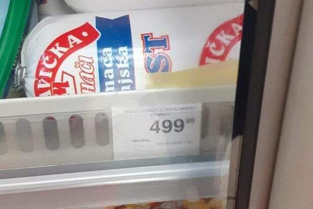 U jednom hipermarketu domaća mast u crevu, pakovanje od kilogram, ima cenu od 499,99 dinara.