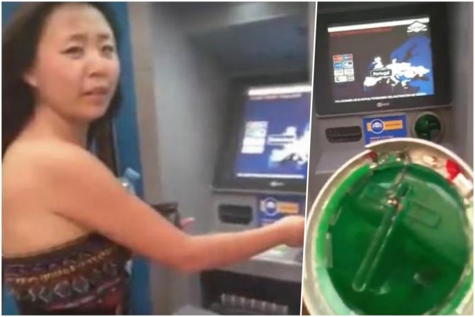 Prišao je desnom bankomatu i postavio je kameru veoma blizu aparata lopova gde se vidi lepak, odnosno da je "skidač" postavljen preko pravog dela bankomata u koji se ubacuje kartice. Potom je naišla jedna žena koju je zaustavio da bi prvo proverio bankomat u koji je ona krenula da ubaci svoju karticu. Srećom, taj bankomat je ispravan.