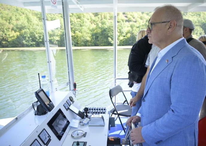 Pre obilaska radova na putu, ministar se provozao jezerom Međuvršje, trimaranom za koji je nadležnima u lokalnoj samoupravi danas, baš on, simbolično, doneo dozvolu za plovidbu.