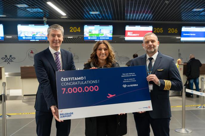Aerodrom Nikola Tesla Beograd će do kraja 2023. godine zabeležiti više od sedam miliona putnika, što je rekordni rezultat, koji prevazilazi broj putnika iz 2019. godine. Sedmomilionitog putnika su na šalterima za čekiranje na novom Terminalu 2 dočekali generalni direktor kompanije Belgrade airport, Fransoa Berizo i izvršni direktor za saobraćaj avio-kompanije Air Serbia, Milan Malović, koji su gospođi Aleksandri Kandić iz Valjeva uručili poklon - vaučer za besplatno povratno putovanje za destinaciju po izboru.