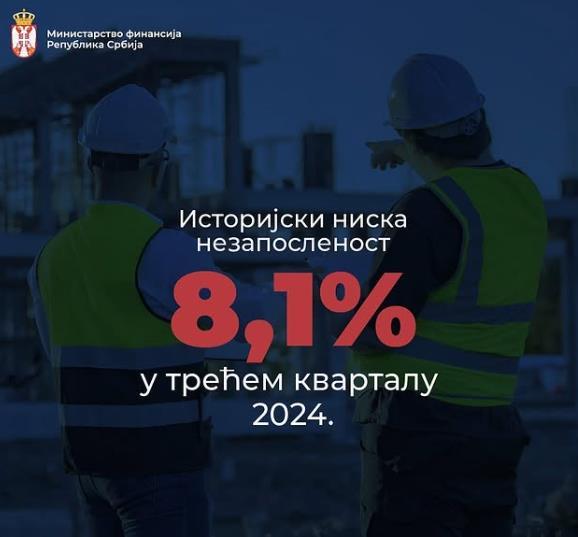 Ministar finansija Siniša Mali objavio je da se odlične vesti za srpsku ekonomiju i građane nastavljaju, što potvrđuju i najnoviji podaci o stopi nezaposlenosti, koja je u trećem kvartalu ove godine iznosila 8,1 odsto.
