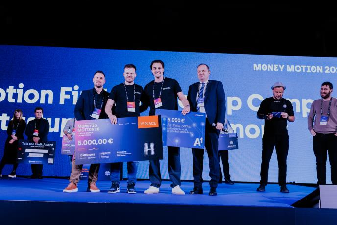Na završnici četvrtog izdanja konferencije Money Motion 2026, na glavnoj bini proglašeni su pobednici ovogodišnjeg Money Motion Startup takmičenja. Ceremoniju dodele nagrada vodio je Luka Sučić, suosnivač konferencije, koji je kroz program predstavio nagrade i pozvao partnere da uruče priznanja najboljim timovima.