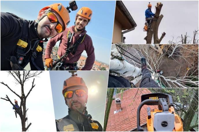 - Osnovna je procena rizika, nakon toga ide postavka. Stablu se može pristupiti na više načina, u zavisnosti od situacije. Uz pomoć penjalice (uvežu se na stopalo i šiljak uranja u stablo), užadi, gurtni.. Oprema je teška oko 15 kilograma, u opremu spada i motorna testera, penjalice, kaciga, itd. Imamo posla, imamo redovne klijente koji rade prevetivno i to je najpametnije. Ljudi su se naplašili nakon pojave superćelijskih oluja i počeli su sa tom preventivnom praksom - navodi Viktor.
