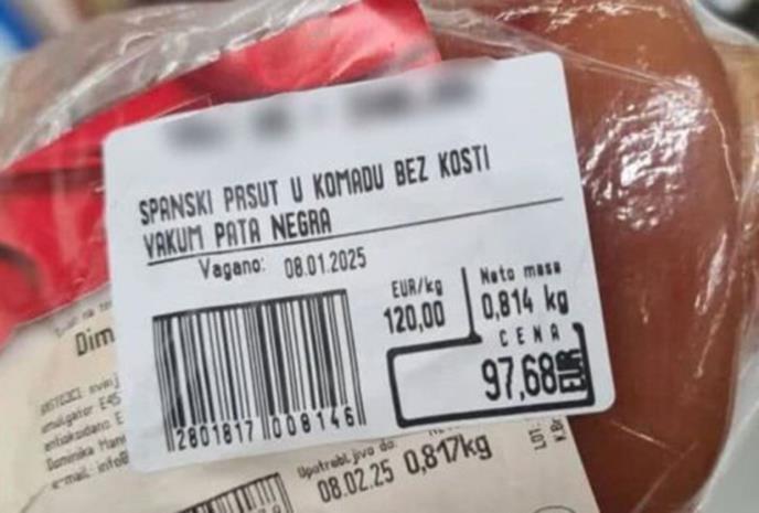 Vakumirani pršut pata negra bez kosti prodaje se u pakovanju od 814 grama i cijena mu je 97 evra i 68 centi.