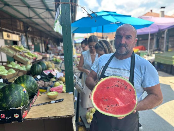 - Ima kupaca na čačanskoj pijaci kao i svakog dana. Za rashlađivanje je najbolje konzumiranje svežeg sezonskog voća i povrća, a svima omiljena je sočna lubenica. Pored dinja koje su izuzetne po žegi, tu su i kajsije. Lubenica je definitivno kraljica slasti! Čuvanje voća i povrća je takođe od izuzetnog značaja, moraju biti u nekom hladnom prostoru, poput hladnjače. Ove lubenice trenutno stižu iz Grčke koštaju 90 dinara za kilogram, ali za nekoliko dana očekujemo i one iz Srema - rekao je za RINU Saša Ćendić, prodavac na čačanskoj pijaci.