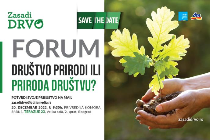 Kako kompanija Adria Media Group i ove godine, u okviru četvrte sezone projekta „Zasadi drvo“, organizuje veliki forum iz oblasti šumarstva na kome okuplja sve relevantne predstavnike stručne javnosti, sa velikom zadovoljstvom Vas pozivamo da svojim prisustvom uveličate ovogodišnji forum pod nazivom „Društvo prirodi ili priroda društvu?“.