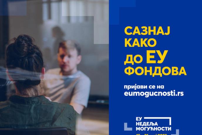 To je glavna poruka EU nedelje mogućnosti - jedinstvene serije događaja koja će se od 21. do 26. juna održati u Beogradu (MTS dvorana), Nišu (hotel „Tami“) i u Novom Sadu (Novosadski sajam). Nedelju mogućnosti partnerski organizuju Delegacija EU u Srbiji i Vlada Republike Srbije.