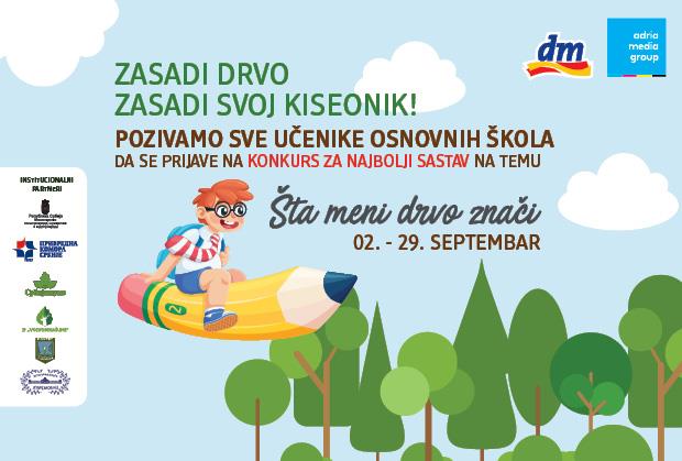U okviru projekta „Zasadi drvo“, koji su pokrenuli „Adria Media Group“ i „dm drogerie markt“, organizuje se konkurs za sve učenike osnovnih škola u Srbiji, koji traje od 2. do 29. septembra 2019.